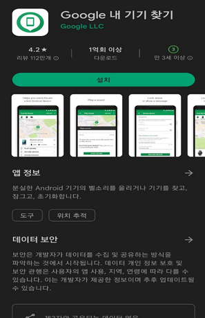 1. 플레이스토어에 들어가서 구글내 기기 찾기라고 검색해줍니다. 그러면 아래와 같은 화면이 나올텐데요. 참고로 갤럭시스토어에도 받을수 있다고 알려져 있으며 원스토어에서는 확인해본바 나오지 않습니다.