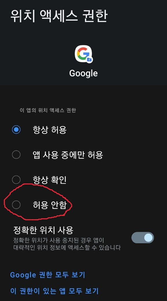 3. 허용안함을 눌러주시면 기능이 해제 됩니다.