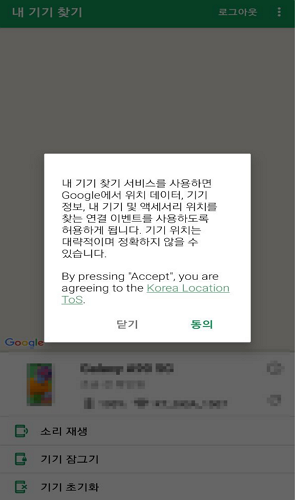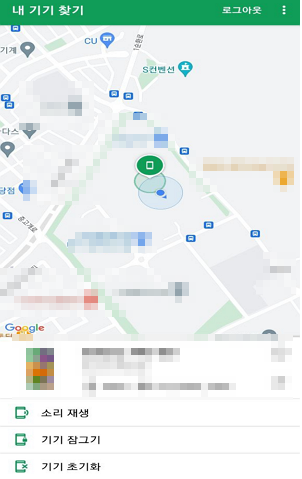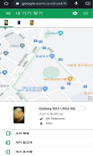 4. 그럼 대략적인 위치가 나오게 되는데요. 상당히 정확합니다. 소리재생을 눌러 찾을수 있구요. 기기 잠그기를 통해 기기를 잠그고 폰을 습득한 사람에게 메세지를 띄워놓을수도 있으며 기기 초기화도 가능합니다.(다만 기기초기화를 하면 더이상 구글 위치추적이 불가합니다.)