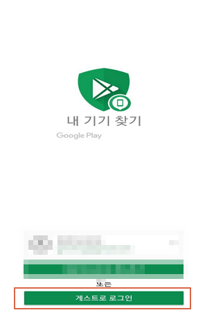 2. 어플에 접속후에 게스트로 로그인을 눌러주셔야 합니다. 상황 자체가 다른 사람의 폰을 빌리는것이기에 다른 구글 계정이 로그인 되어있을텐데요. 나의 휴대폰을 찾는것이기에 내 휴대폰을 검색해주세요.