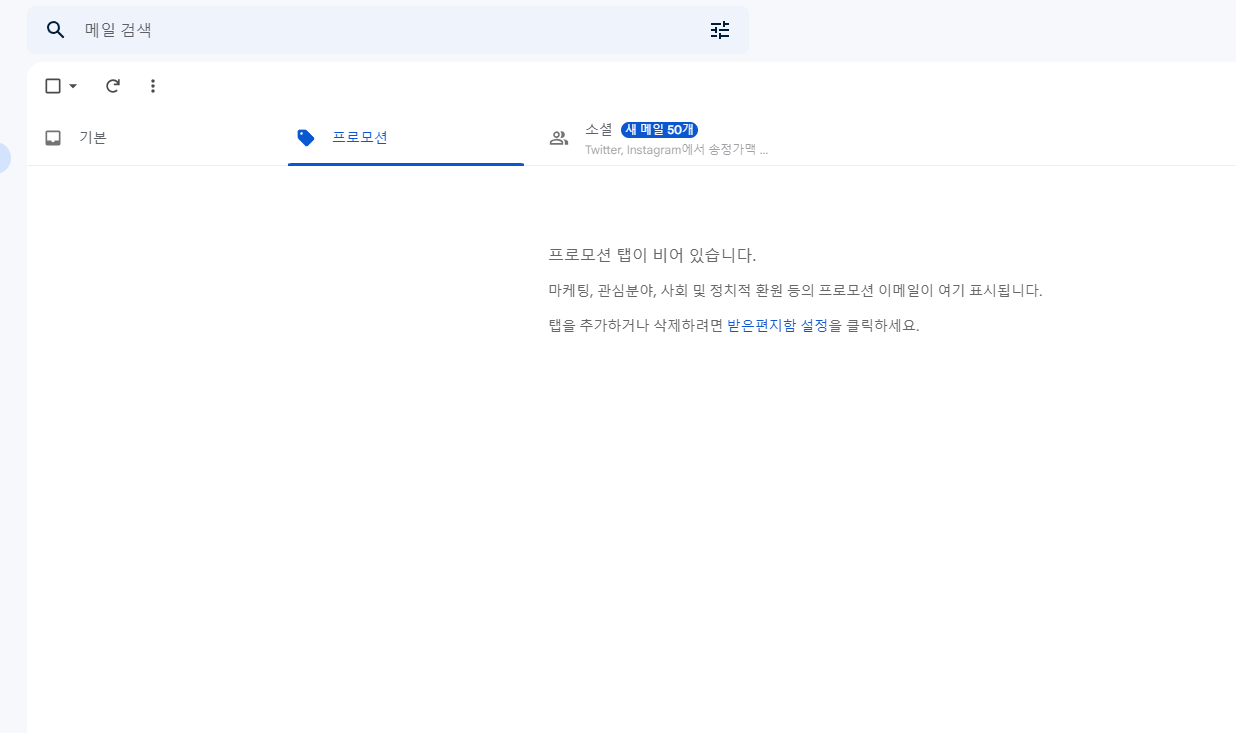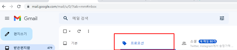 메일에 접속하셧으면 아래와 같은 기본 접속화면이 뜨게 됩니다. 기본 메일함에는 다양한 자료들과 클라이언트들과의 자료가 있으니 프로모션에서 지워보도록 하겠습니다. 원하시는 분들은 바로 기본함에서 삭제해주셔도 괜찮습니다.