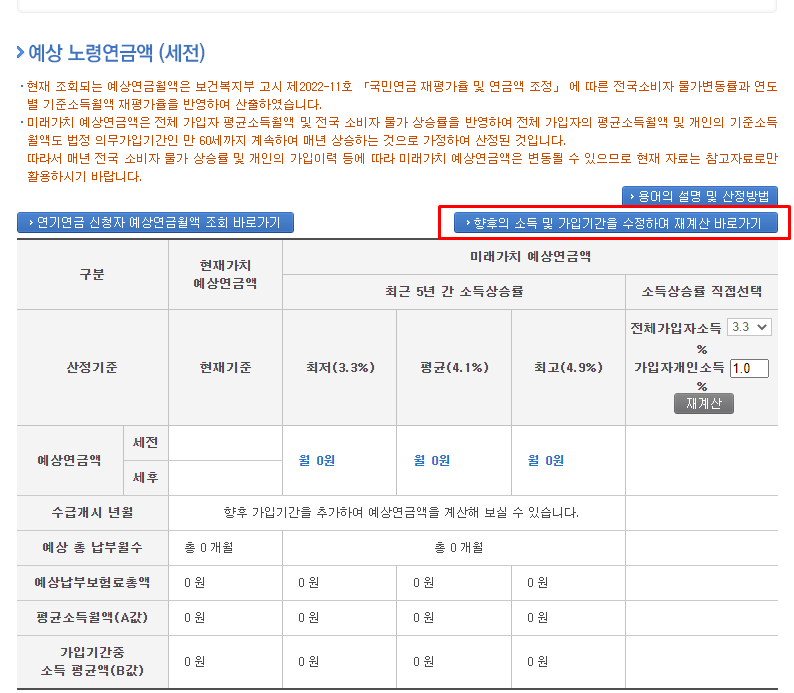 3. 향후의 소득 및 가입기간 재입력하고 재계산하고 조회 하시면 내가 받을 연금의 예상수령액이 산출됩니다.