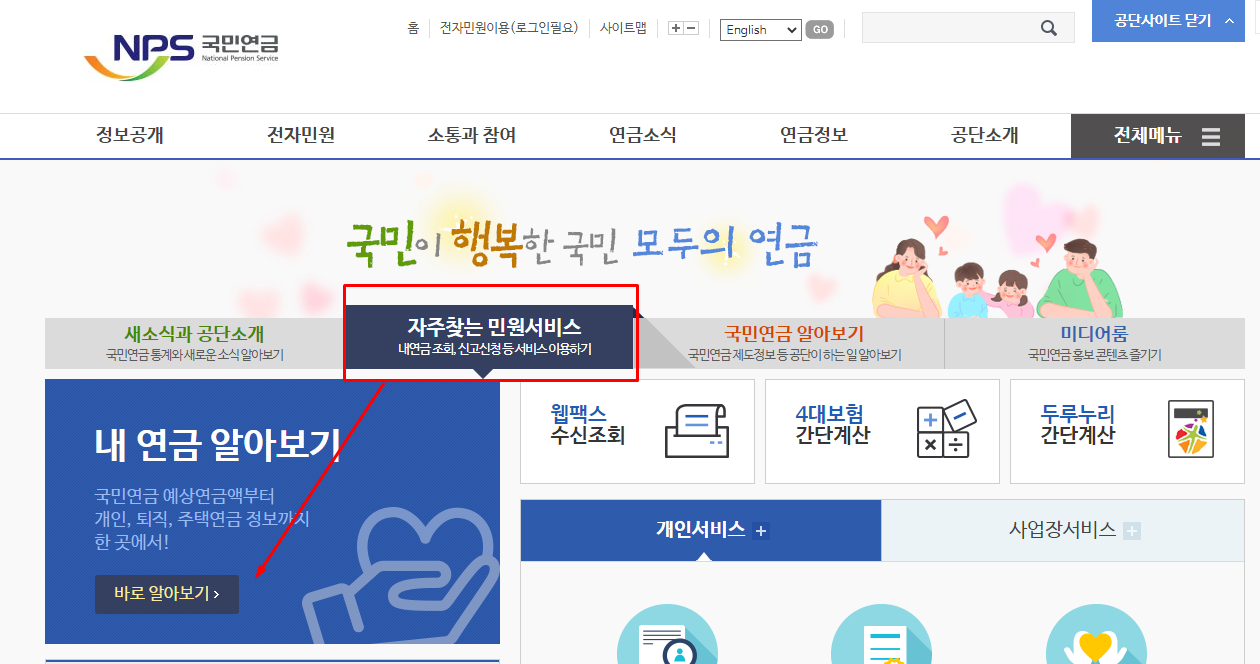 1.국민연금 사이트에 접속후 자주찾는 민원에서 내 연금알아보기 클릭