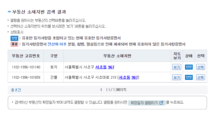 3. 주소지를 입력하면 아래와 같이 토지와 건물 두가지로 나눠져서 선택할수 있습니다. 두가지중 원하는것을 선택버튼을 눌러주세요.