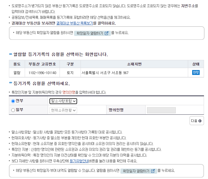 4. 그 후 나오는 정보들(말소권리, 주민번호 등등)을 원하는데로 선택하시고 결제를 하고 열람하시면 됩니다.