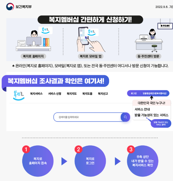 복지멤버십 가입은 3가지 방법으로 할수 있는데요. 1)복지로 홈페이지 2)복지로 모바일 앱 3)전국 동·주민센터에서 가능합니다. 복지로 홈페이지 홈페이지 맞춤형 급여 안내를 먼저 가입 신청해야하며 가입이 완료된 후에 내가 받을 가능성이 있는 서비스 안내를 받을수 있을습니다.