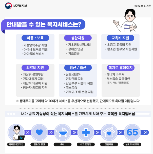 기존에는 기초수급자나 차상위계층 신청이 가능했던 이 서비스는 22년 9월5일부로 전국민을 대상으로 확장하게 되었습니다. 온라인으로 한번만 신청해두면 나 자신은 물론 가족이 받을수 있는 혜택이 안내 되게 되며 23년부터는 나라던 지방 자치 단체던 많은 복지 혜택이 안내 되기 때문에 무조건 가입해놓는것이 이득입니다.