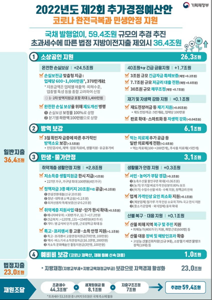 이번에 59.4조원의 추경 규모 중 지방에 이전하는 23조원을 빼면 실제 규모는 36조 4000억원규모가 될것인데 이중에 26조 가량을 소상공인지원에 푼다고 하니 정부의 각오가 대단해는 보입니다.