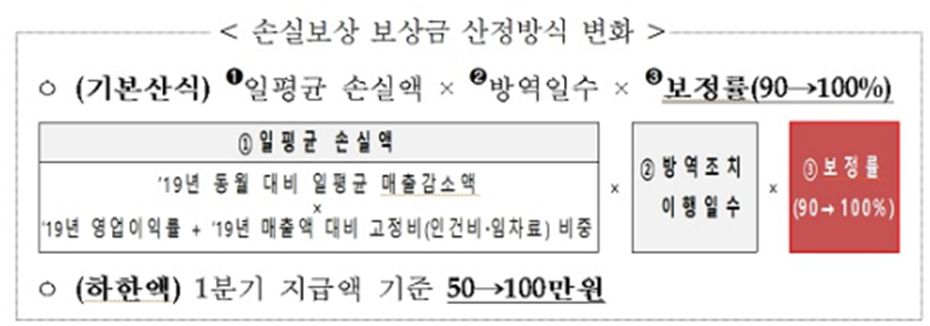 일평균 손실액과 방역일수를 곱하고 거기에 기본 90%였던 보정률을 100%까지 올려서 산정하게 됩니다. 이 말은 방역조치를 따르는 동안 발생한 손실을 100% 보상해준다는 의미가 됩니다.