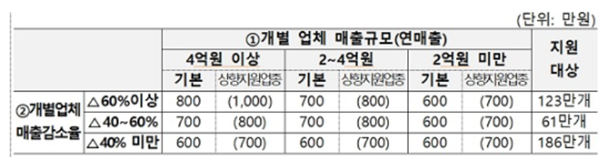 소상상인과 자영업자 그리고 소기업은 매출의 규모와 매출감소율 수준을 파악해서 등급.지수화해서 최소 600에서 800만원까지