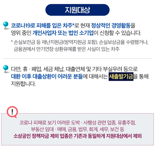 코로나 19피해를 입은 분들은 손실보전금을 받을수 있었는데요. 이런 사실이 있으신분들은 대상자가 됩니다.다만 상황상 휴업이나 폐업, 세금체납이나 대출연체등등으로 대환이후 상환이 어려울것이라고 판단되면 새출발기금으로 지원합니다. 지원이 제외되는 업종이 있는데요. 코로나와 무관한 업종은 지원 제외 대상입니다. 자세한 사항은 아래링크를 참고해주세요.