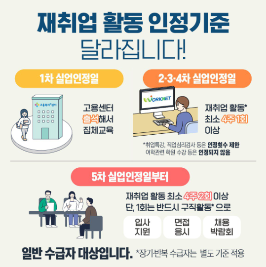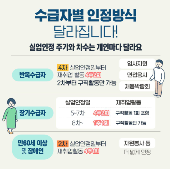 | 반복수급자 | 4차 실업인정일부터 재취업 활동(입사지원,면접,박람회 등) 4주 2회 2차부터 구직활동만 가능 |