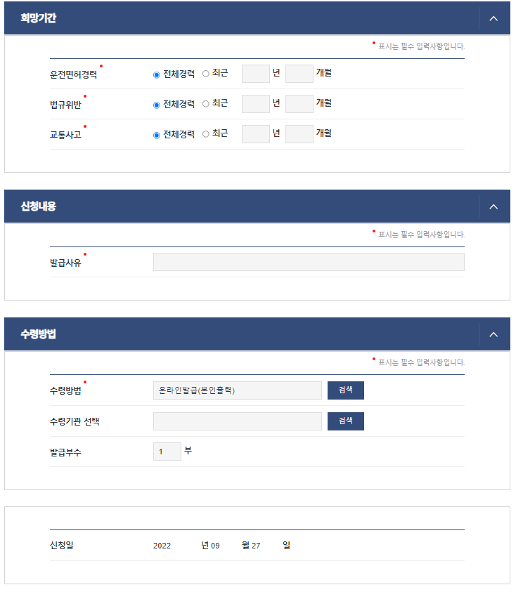 - 운전경력증명서 발급신청서 작성