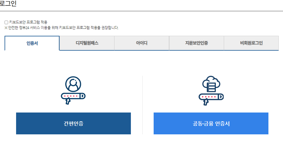 2. 발급버튼을 누르면 로그인 화면이 나옵니다. 로그인을 해주세요. 어차피 인증서가 필요하니 간편인증 공동인증 평소에 하시던데로 인증하시면 됩니다.
