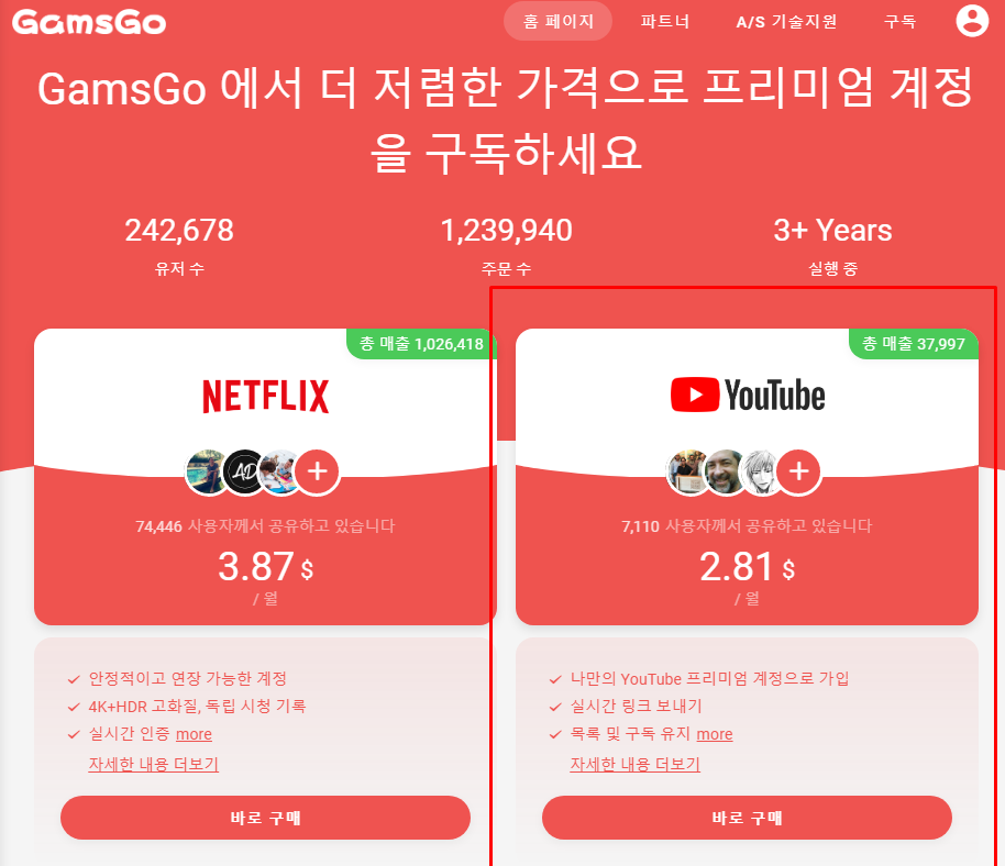 우선 겜스고라는 사이트를 이용하여 사용할수 있습니다. 갬스고는 유튜브뿐 아니라 넷플릭스같은 OTT서비스를 여러명 모아서 같이 이용할수 있게 해주는 중개 플랫폼입니다. 그러니까 친구나 지인끼리 돈 나눠서 OTT이용하자고 하면 여러가지 일이 벌어지는데 그걸 방지해주는 중개 플랫폼입니다. 이것을 가족끼리 사용하는 방법입니다. 아래에 사용방법 설명하겠습니다.