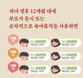 자녀생후 12개월내에 부모가 동시 또는 순차적으로 육아 휴직을 사용하는 경우, 첫 3개월에는 기존 통상임금 80%가 아닌 각각의 육아휴직 급여를 상향하여 지급받을수 있습니다.