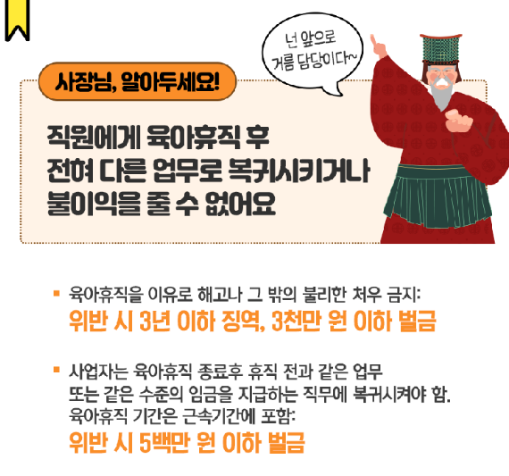 ▶복직후에도 동일한 업무 또는 같은수준의 임금을 지급하는 직무에 복귀시켜야 해요. 위반시 벌금 5백만원 부과되요