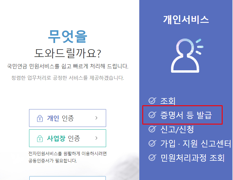 4. 인증이 완료되면 개인서비스에서 증명서등 발급 항목을 눌러줍니다.