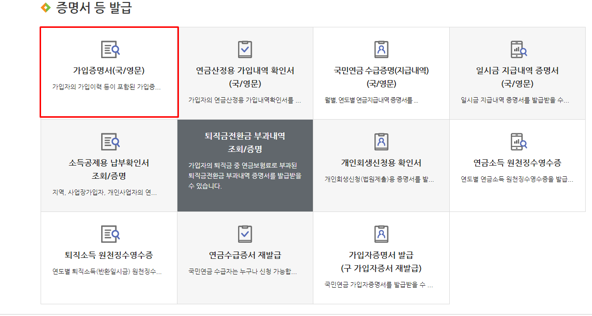 5. 누르시면 여러가지 항목이 나오는데 거기서 가입증명서를 클릭해주세요