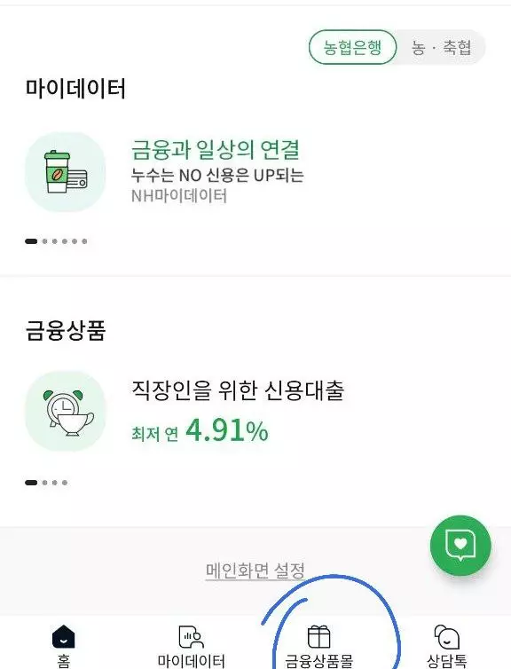 1. NH뱅킹에 접속해줍니다. 그후 메인화면의 상품몰로 접속해주세요.(각 은행마다 상품몰이 있습니다. 거기로 접속해주시면 됩니다.)