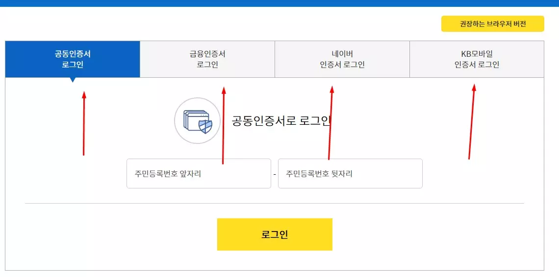 3. 공동,금융,네이버,KB중 본인에게 맞는것으로 로그인하기