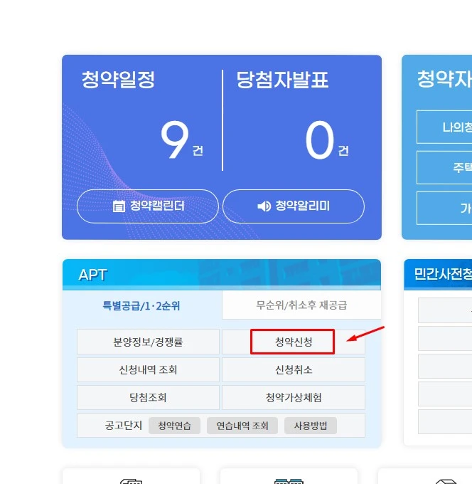 청약홈페이지 메인에 바로 보이는 아파트 항목에서 신청을 눌러주세요