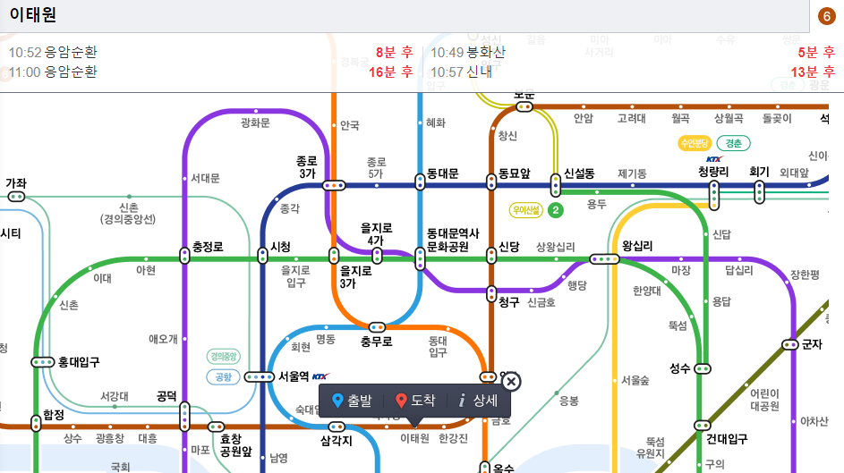 화면처럼 수도권과 부산 대구 광주 대전같은 다른 광역시의 지하철 노선도까지 확인이 가능합니다. 하나만 선택해서 예시를 들어볼까 합니다. 이태원역을 예시로 들어보겠습니다.
