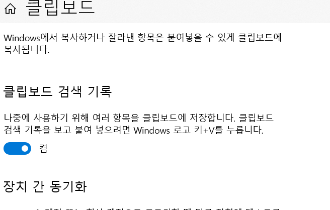 그리고 클립보드 항목이 보이시죠? 들어가 보면 활성화를 할 수 있는 버튼이 바로 보이실 겁니다.