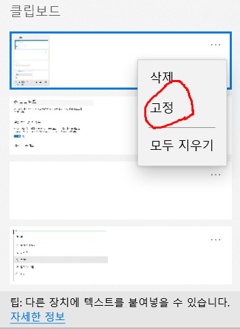 자, 이렇게 클립보드를 띄우면 클립보드에 저장되어 있는 여러 가지 글들과 사진 파일들을 볼 수 있습니다. 그런데 순서대로 정리되는 클립보드의 특성상 원하는 자료가 뒤로 밀릴 수도 있습니다. 그럴 때 사용하기 좋은 고정 기능입니다.