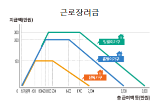 | 홑벌이가구 | 배우자나 자녀가 있는 경우이면서 둘중 한명이 300만원 밑으로 벌어야 합니다. |