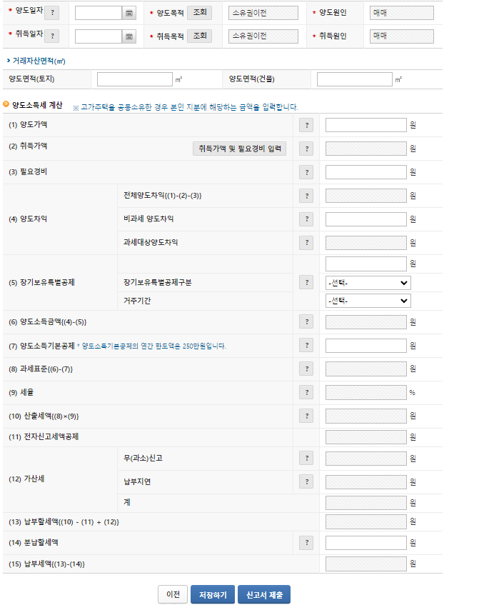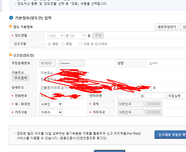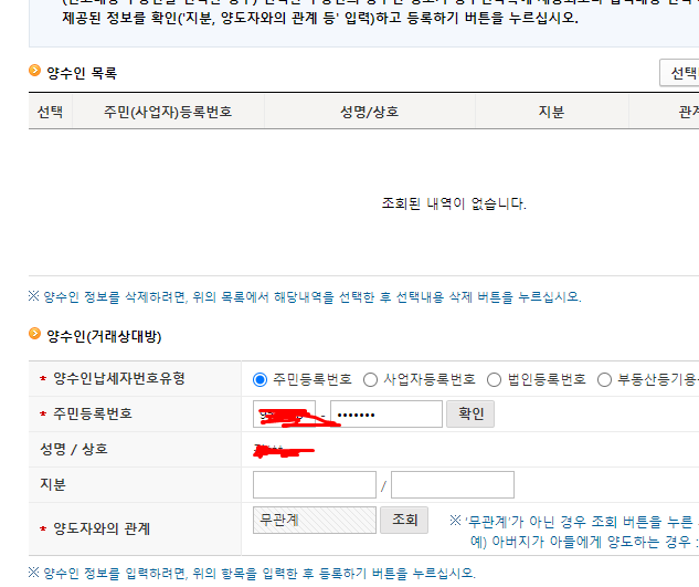 3. 본인의 정보와 양수인의 정보를 입력하고 거래일자및 기타 자세한 부분을 입력해서 신고서를 제출합니다.
