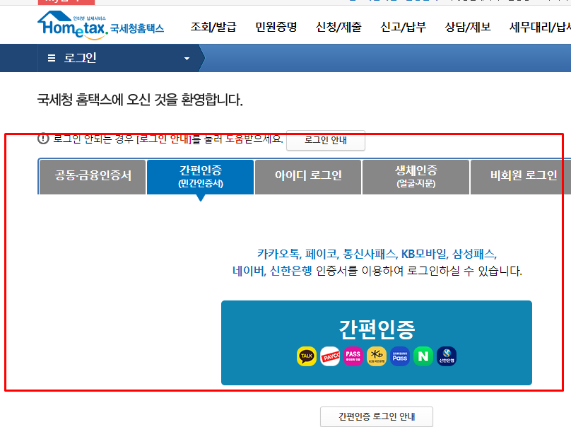 1. 홈택스에 로그인 해줍니다. 로그인 방법은 편한것으로 해주세요. 저는 민간 인증이 훨씬 편해서 사용중입니다.