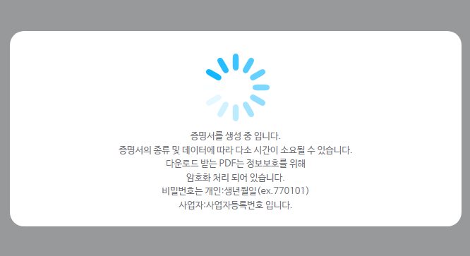 6. 증명서 생성이 완료되면 PDF로 증명서를 다운로드 할수 있습니다.(비밀번호는 생년월일 6자리 입니다.)