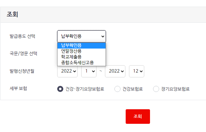 4. 발급용도와 영문/국문여부,발행신청날짜와 종류를 선택하고 조회를 합니다.(발급용도는 학교제출용,증명용,연말정산용 용도에 맞게 선택)