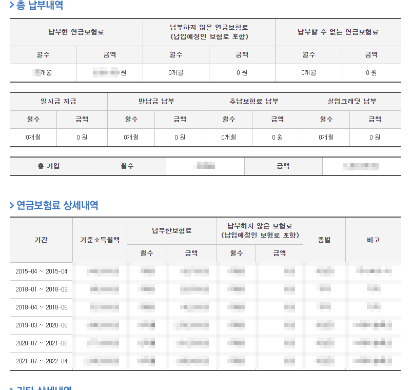 그럼 아래와 같이 화면이 나오게 되며 내가 총 몇개월을 납부했는지 그리고 총액얼마나 납부했는지가 나옵니다. 맨 아래에는 내가 얼마나 받을수 있는지 나오는데 최소 납입기간을 채우지 못하면 조회가 되지 않습니다. 최소기간을 늘리던가 납입금액을 늘려야하는데 이는 국민연금공단 1355에 문의를 해봐야 합니다. 개개인의 실정이 다 다르기 때문입니다.